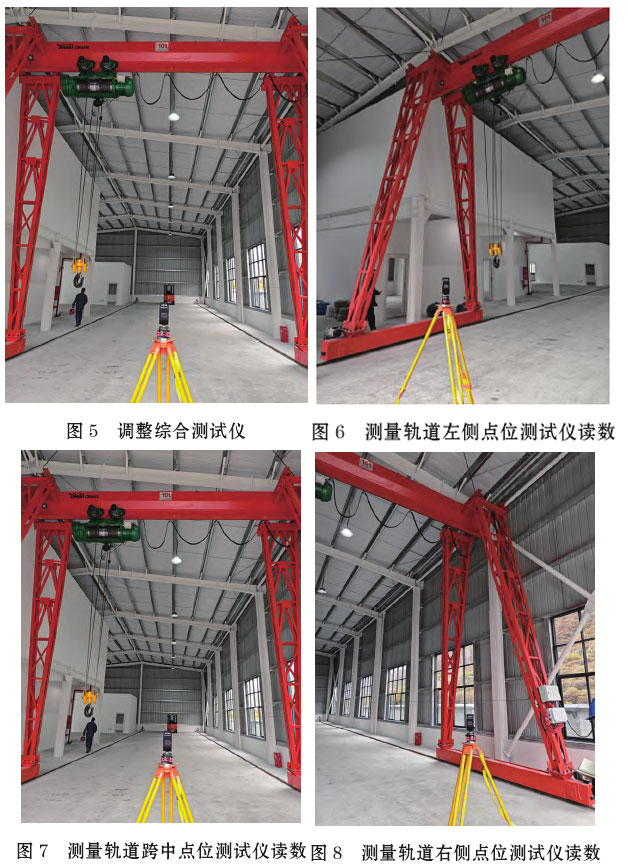 司,該設(shè)備于2023年5月19日校準(zhǔn),設(shè)備正常。面對主梁,放置綜合測試儀,調(diào)整水平(圖5)。將電動(dòng)葫蘆運(yùn)行至左側(cè)接近支腿處,露出軌道端部便于后續(xù)測量。